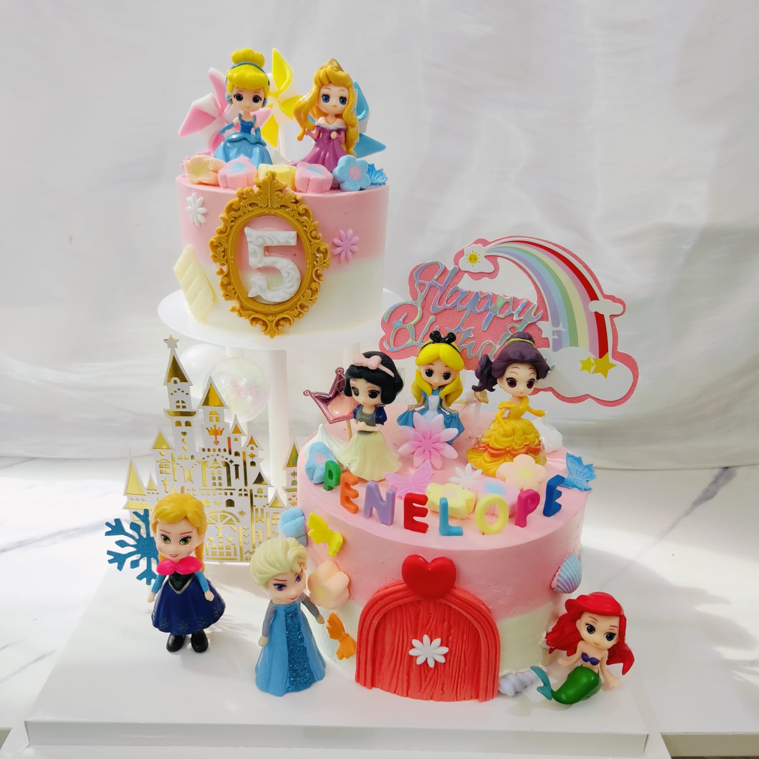 Styling: This suspended double cake frosting with white and pink buttercream. Decorated with fondant flowers, windmill, marshmallow, chocolate bar, swiss meringues.. Happy birthday topper and customised name/age are included. Comes with 6s set princess.
