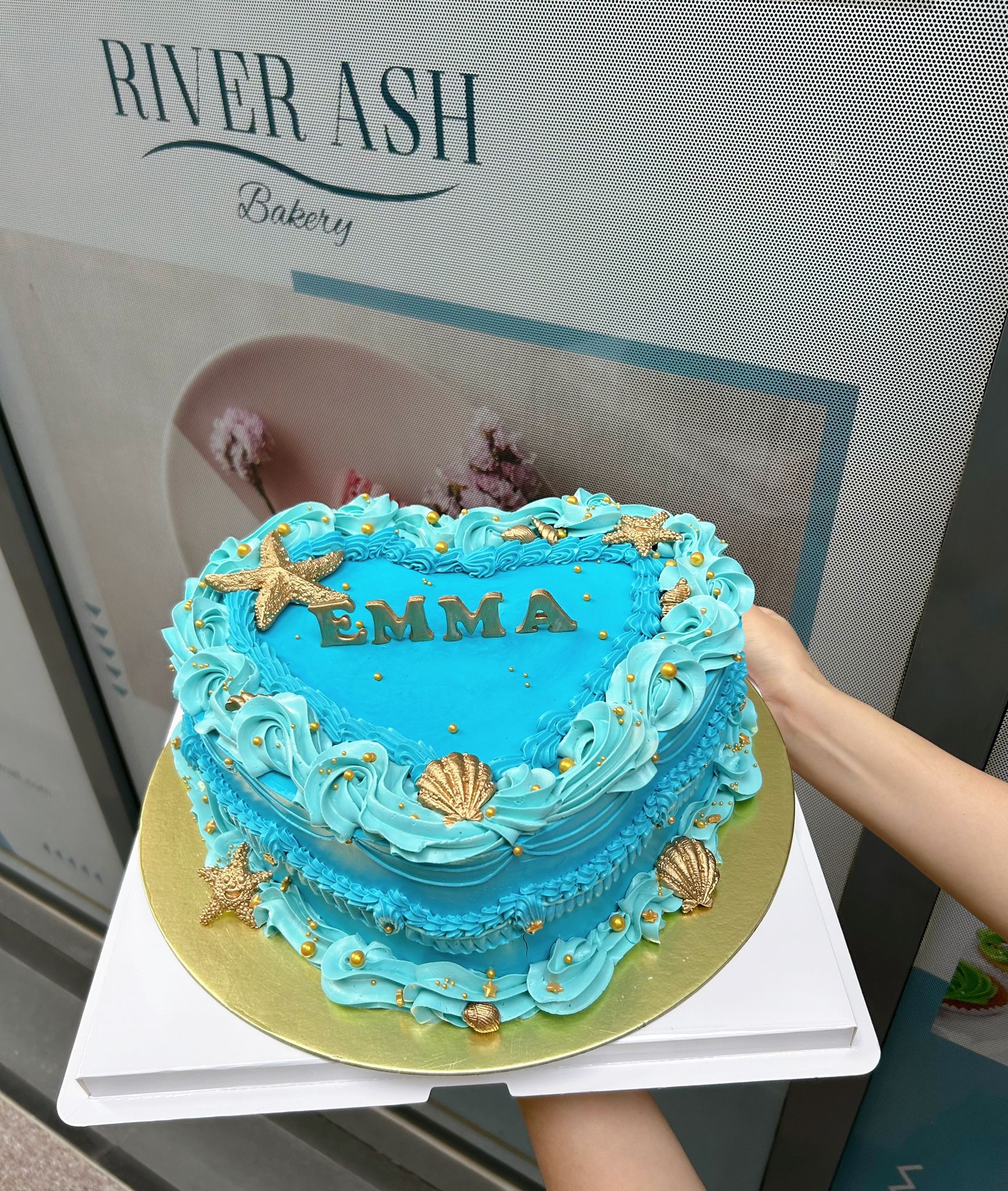 Styling: This heart-shaped cake finished in a vibrant turquoise blue, reminiscent of clear sea water with wave swirls piped around the edges like ocean currents.