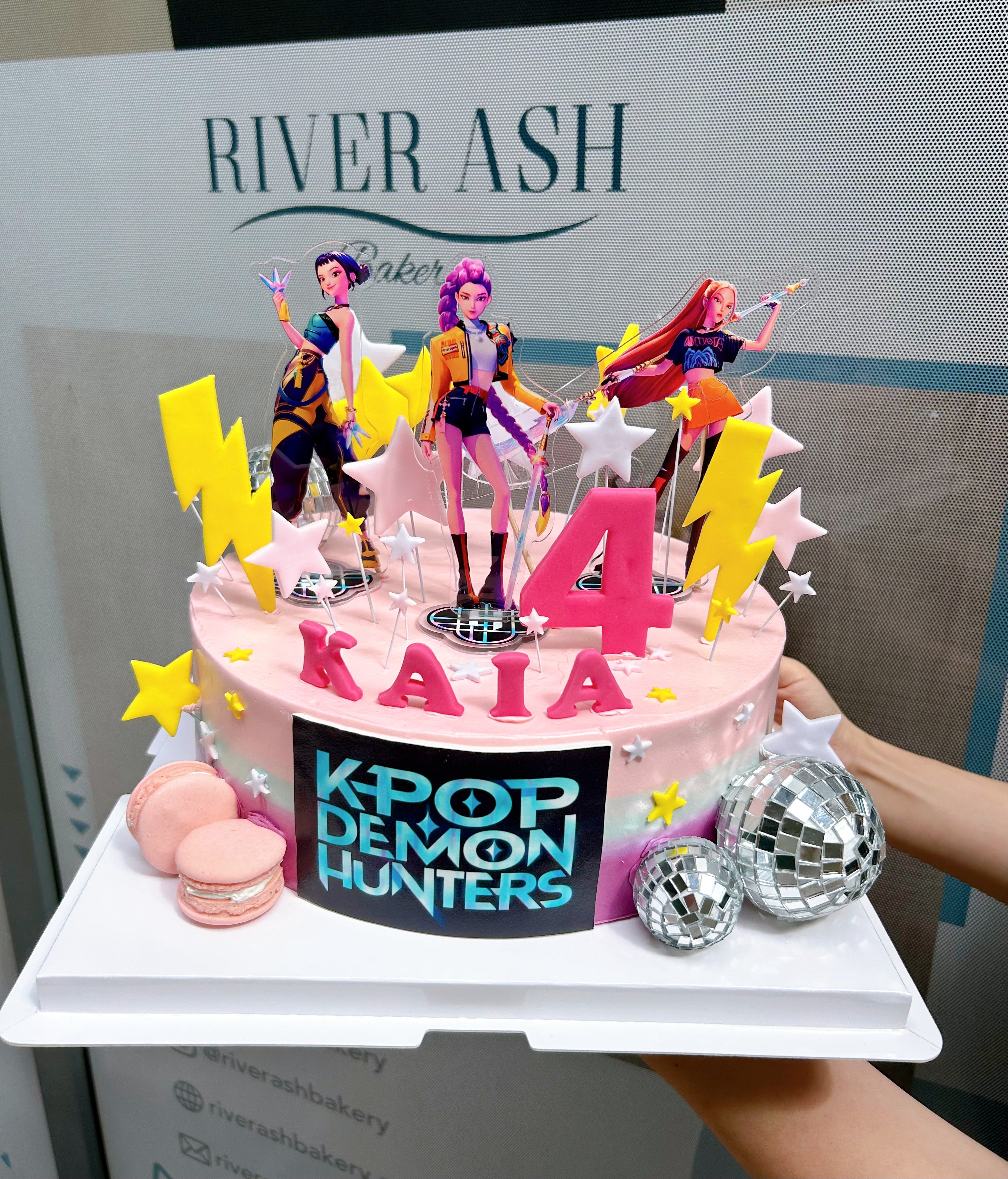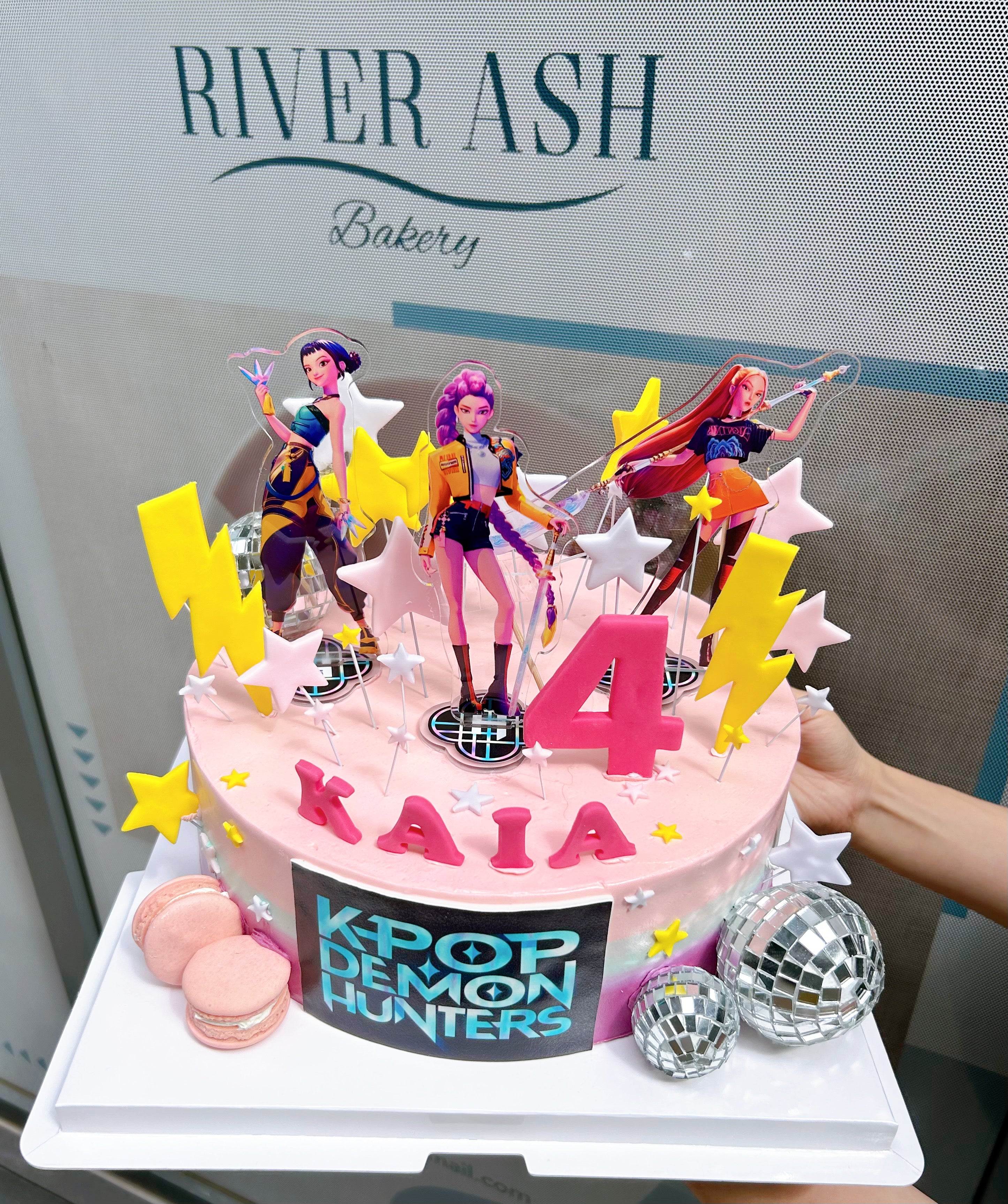 Styling: This cake is frosted with pink, tiffany and purple color buttercream, Decorated with fondant starts and lightnings, and fondant edible K-pop demon hunters image, pink macarons and 2 non-edible disco balls. Comes with 3 Acrylic printed out stand Rumi, Mira and Zoey (around 15cm height each). Fondant name and age add on separately.