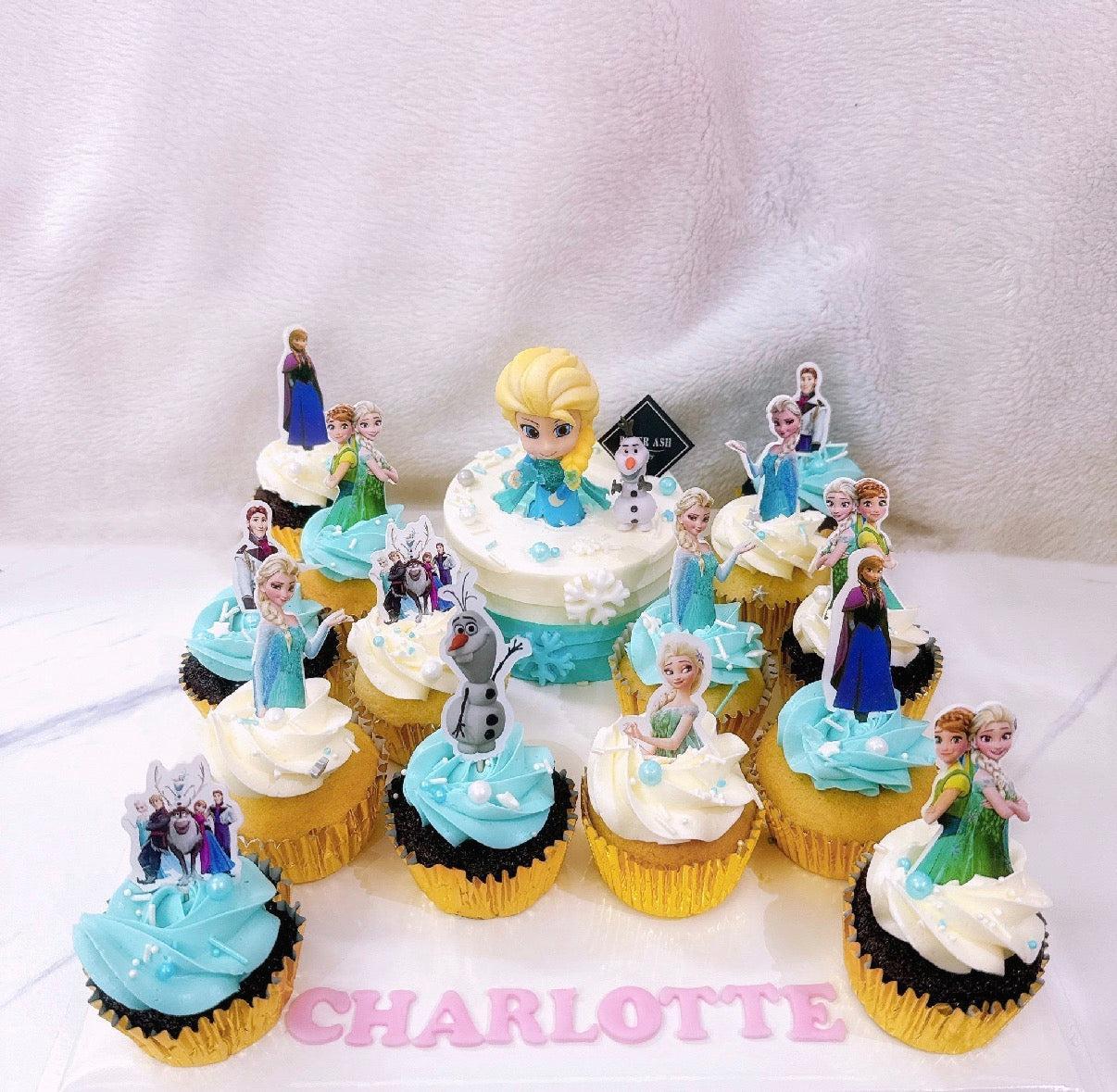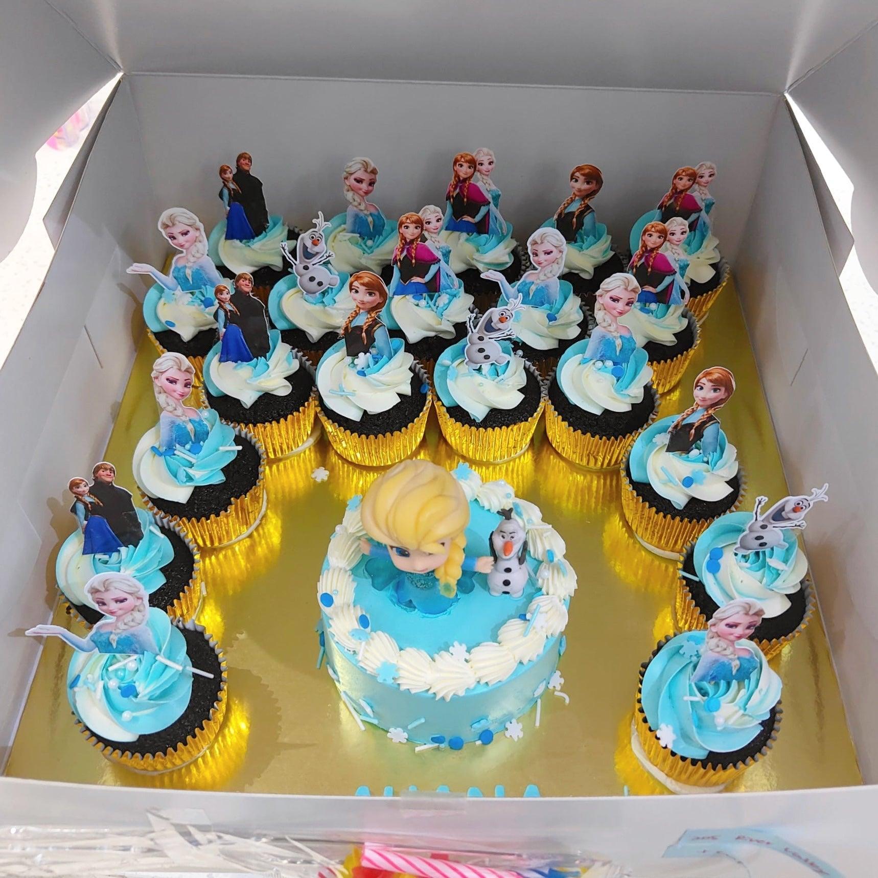 Styling: This 4" mini cake is Frozen themed with toy Elsa and Olfa with matching paper topper cupcakes. Our 4" mini cake and cupcakes platter series are popular, ideal for kids school celebration and great for gifting!