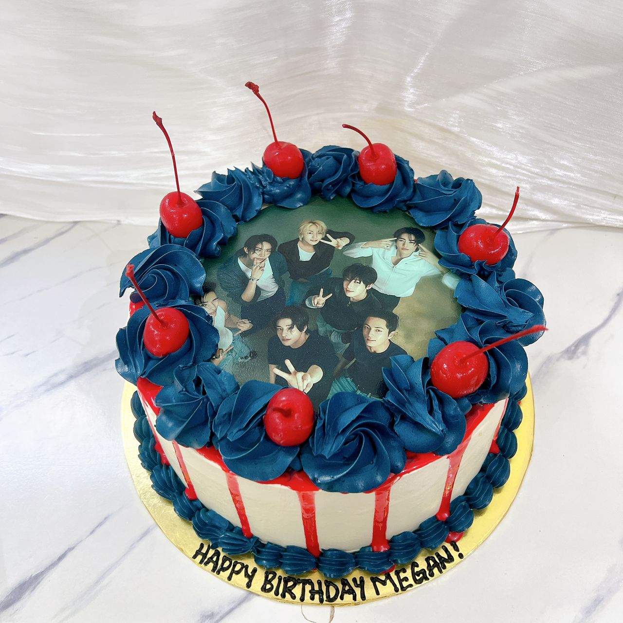 Styling: This cake is frosted with white and blue theme buttercream and cherries. The edible image is customisable.