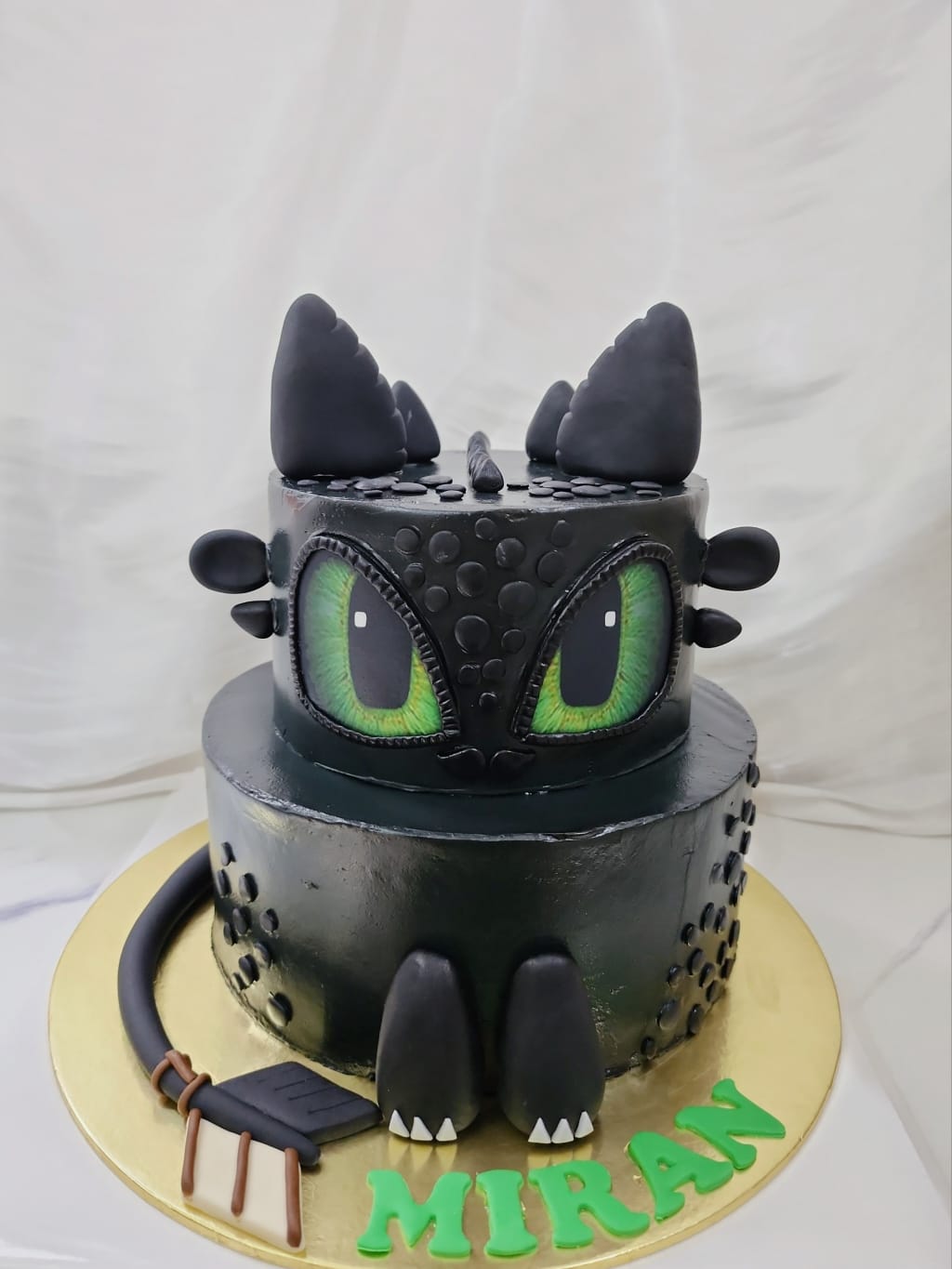 Styling: This cake is frosted with black green swiss meringue buttercream and fondant features like his jet-black scales, bat-like wings and green cat-like eyes (edible image).