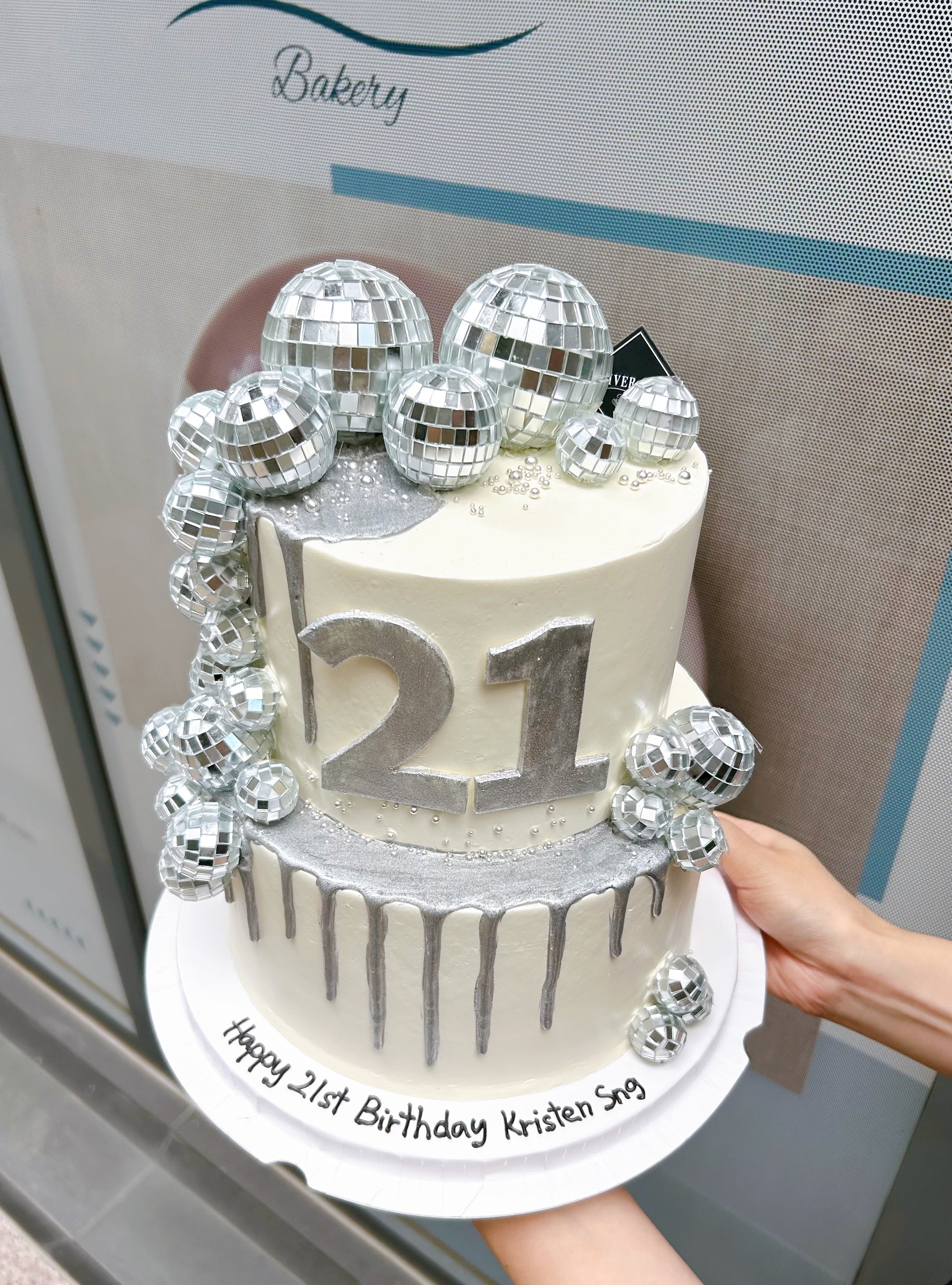 Styling: This cake is frosted with smooth buttercream with silver chocolate drips. Decorated with disco balls(non edible), silver sprinkles. Fondant name and age are add on items.