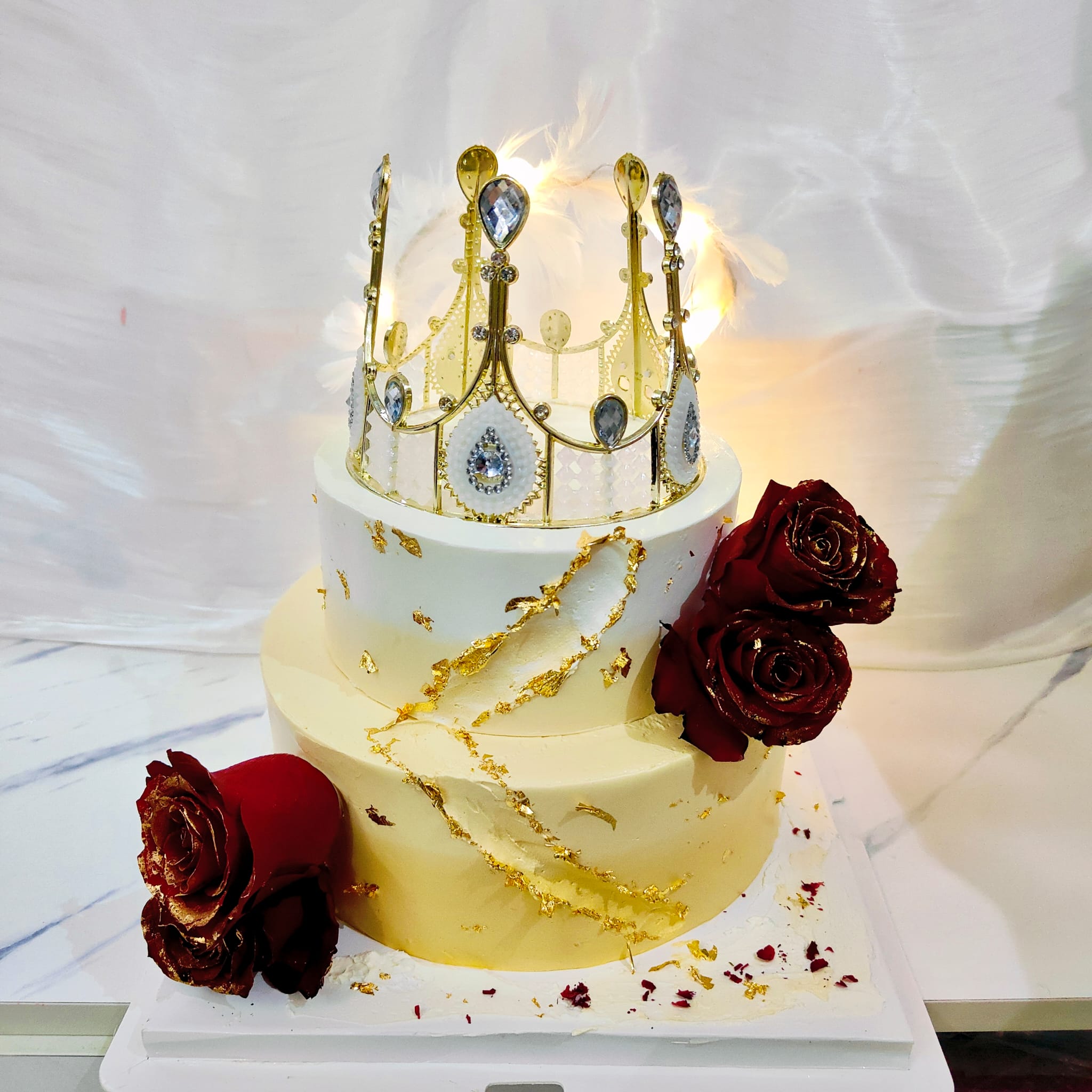 Styling: This cake is frosted with smooth buttercream, decorated with gold paper, rose. Topped with a queen crown with feather!