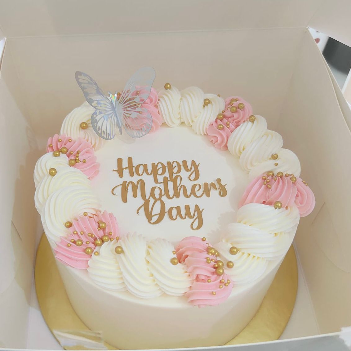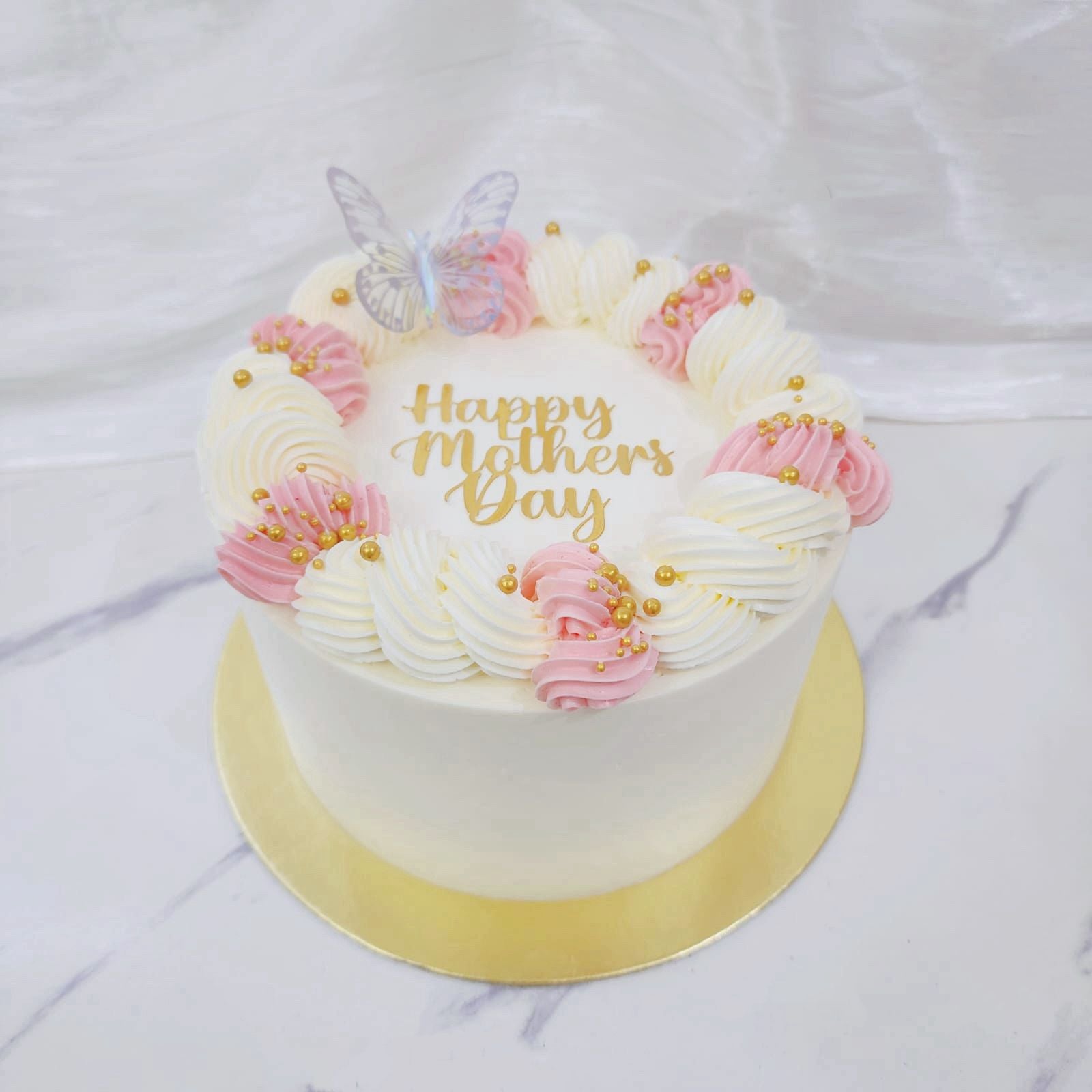 Styling: This cake is frosted with smooth buttercream with bubble wreath white and pink piping. The butterfly and "Happy Mother's Day" are toppers and inedible.