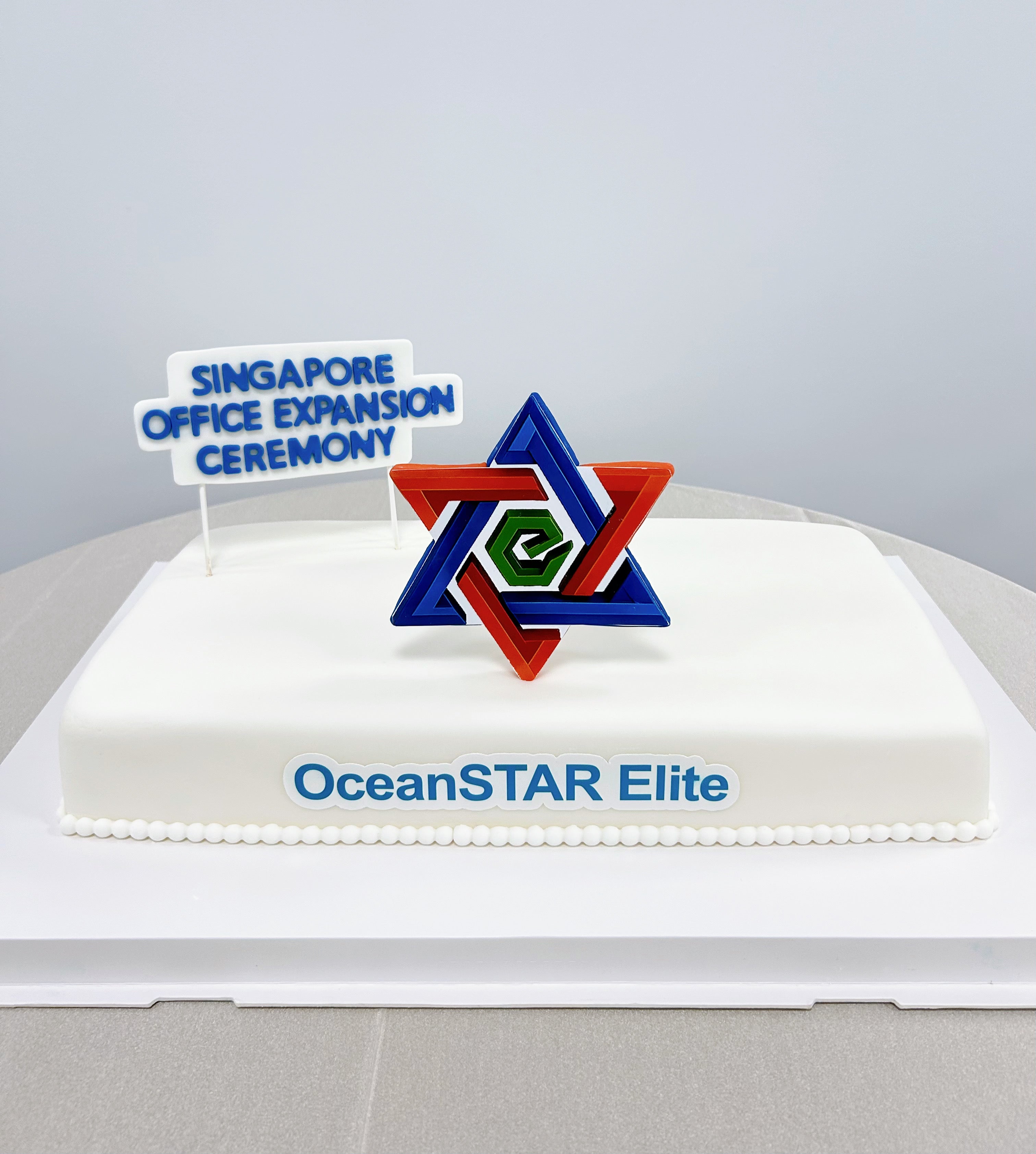 Styling: The cake is frosted with white and custom colored shell piping, covered with edible image with brand logos.