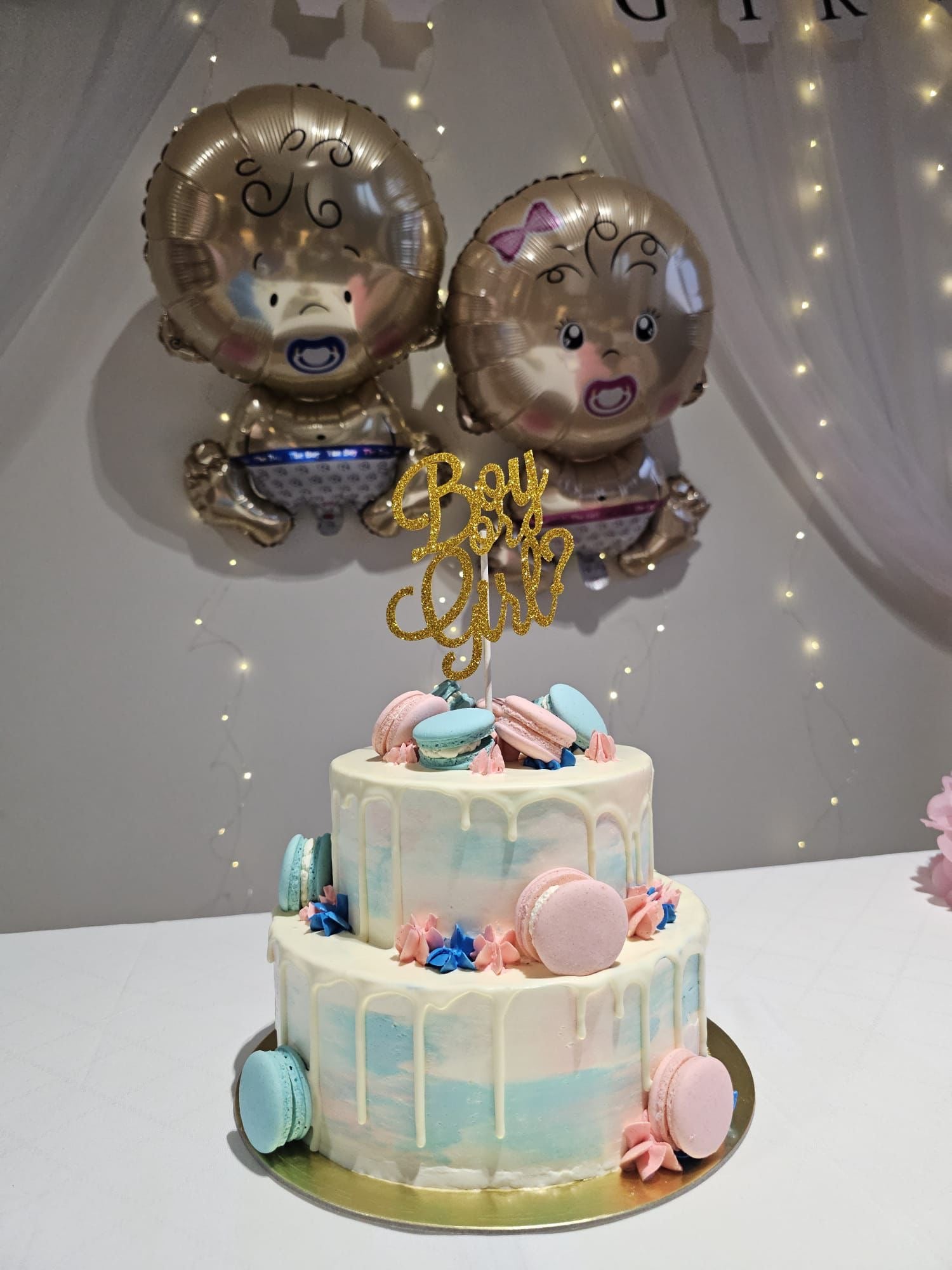 Styling: This cake is frosted with blue and pink watercolour buttercream, decorated with pink and blue macarons, piping and white drip. When the cake is cut, it will be either chocolate cake with pink/blue cream, or pink/blue vanilla cake with white cream depending on the gender! A memorable experience and celebration event!