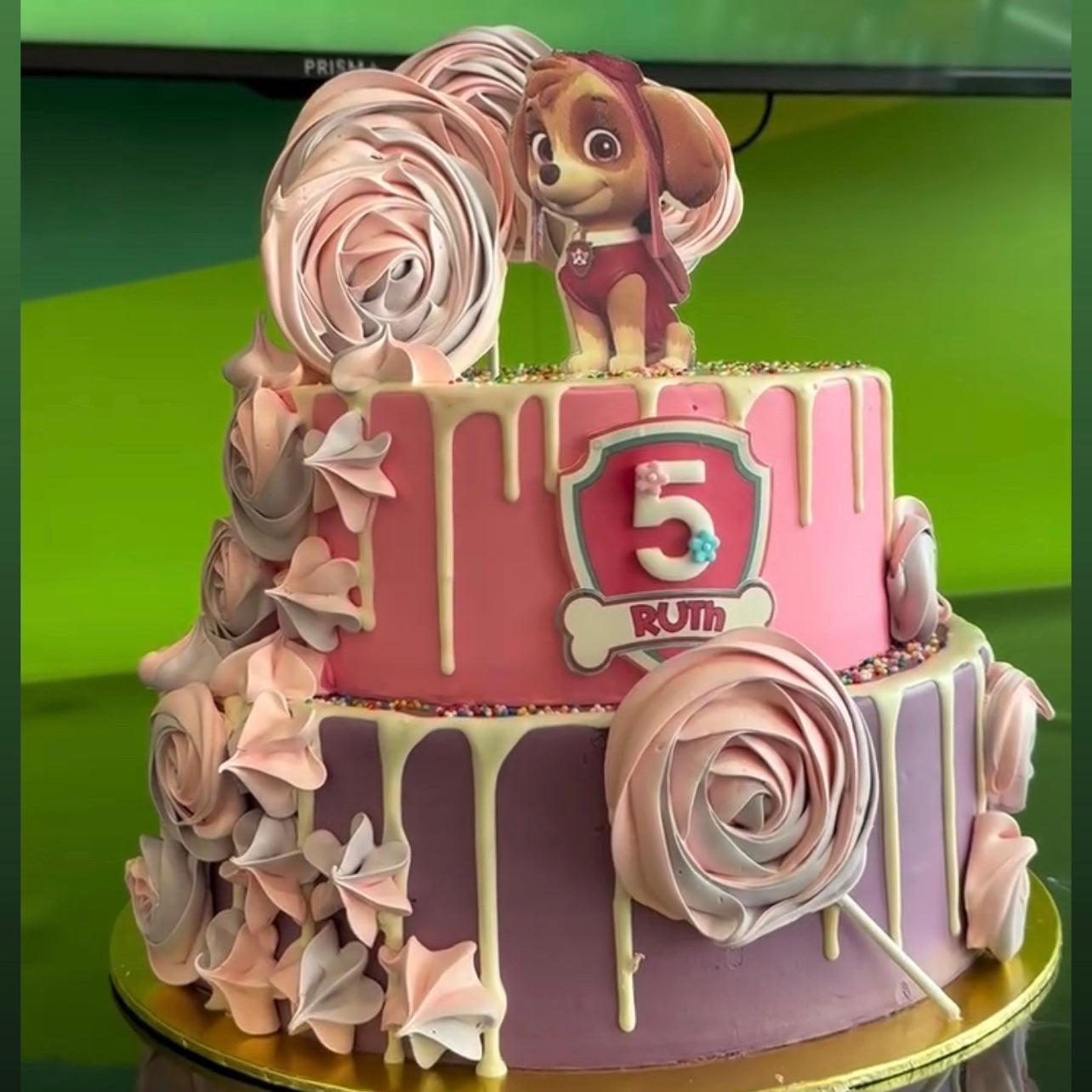 Styling: This cake is frosted with pastel pink buttercream, covered with yummy white ganache drizzle, comes with paper skye topper, meringue lollipop and sprinkles!